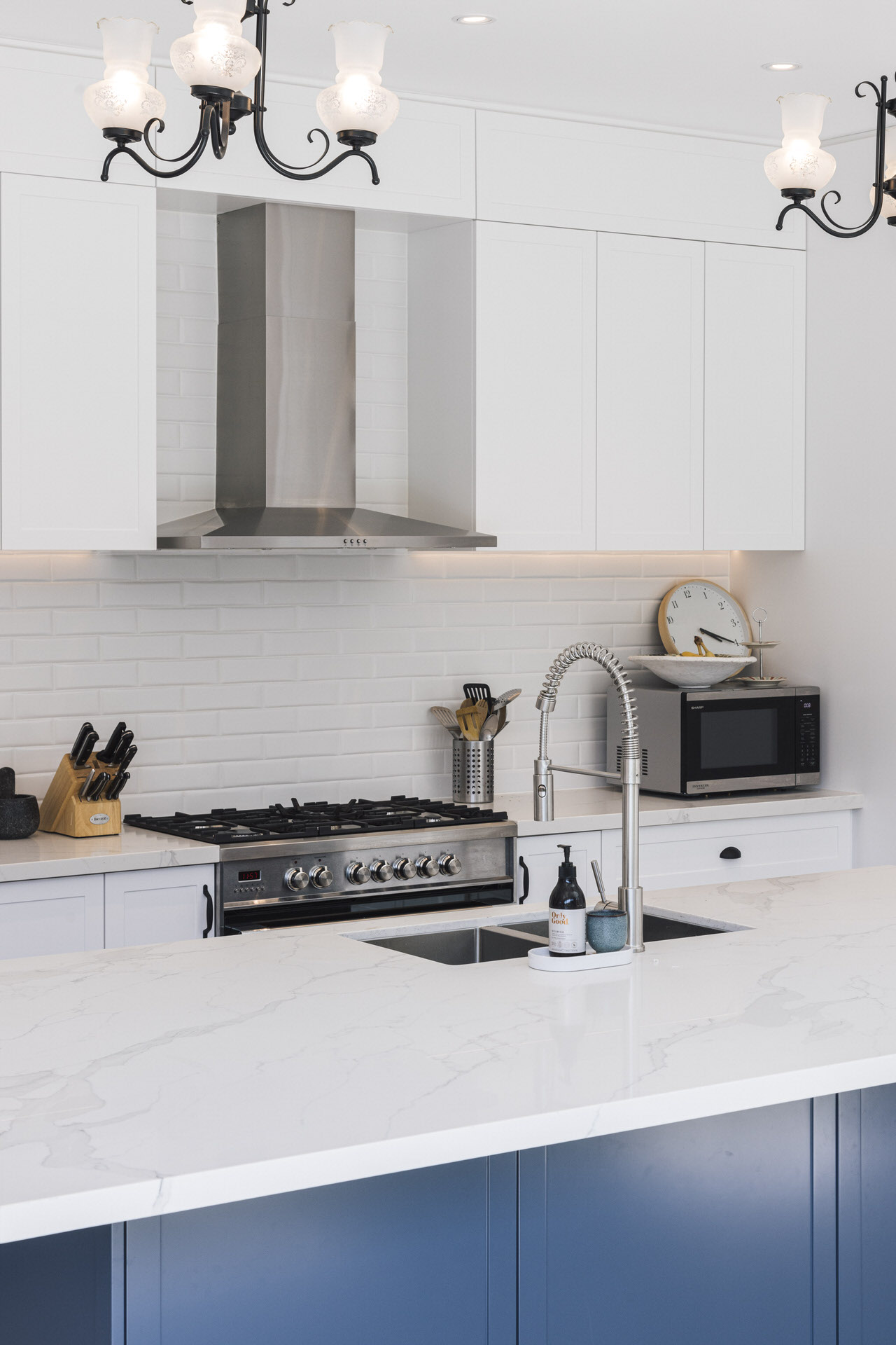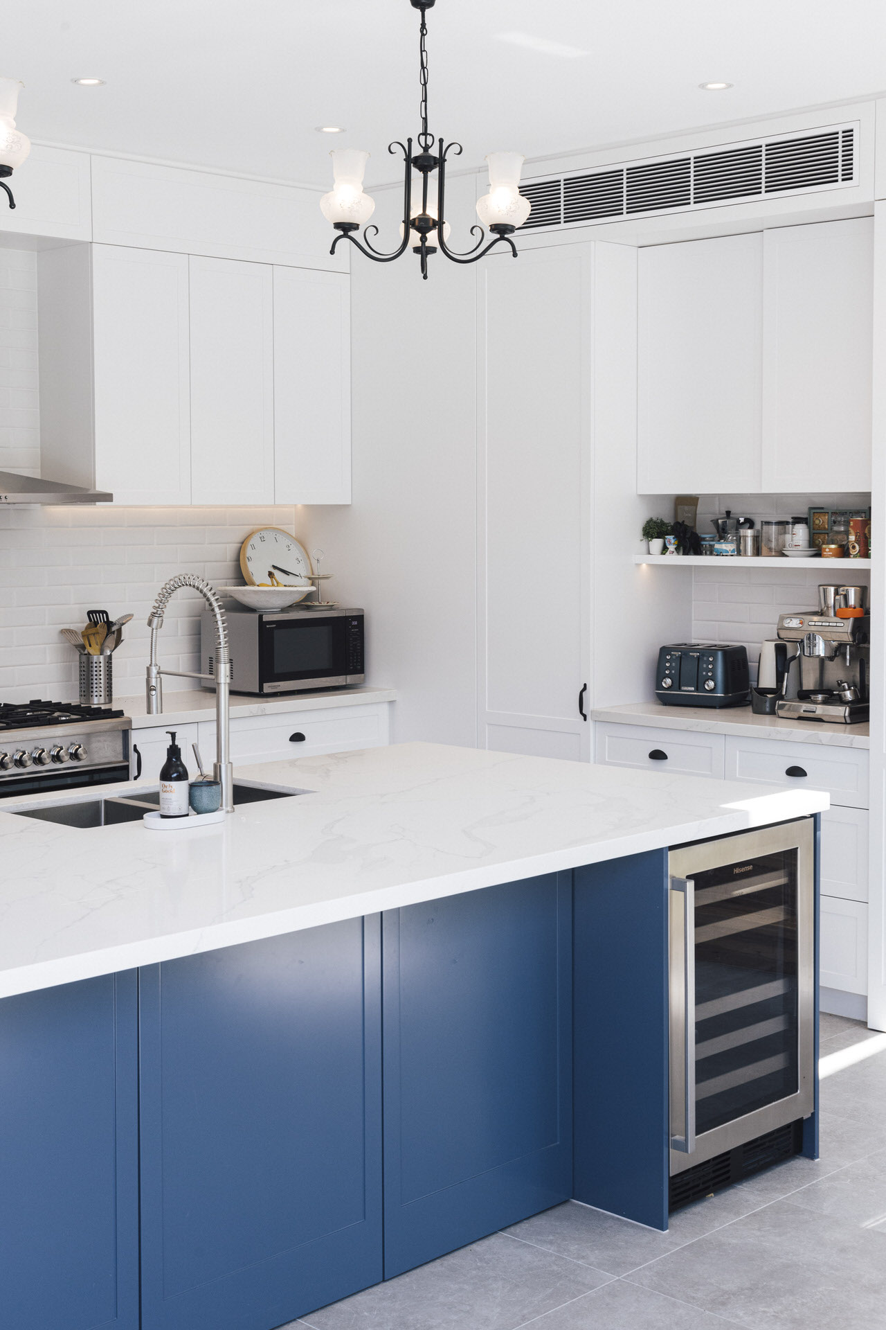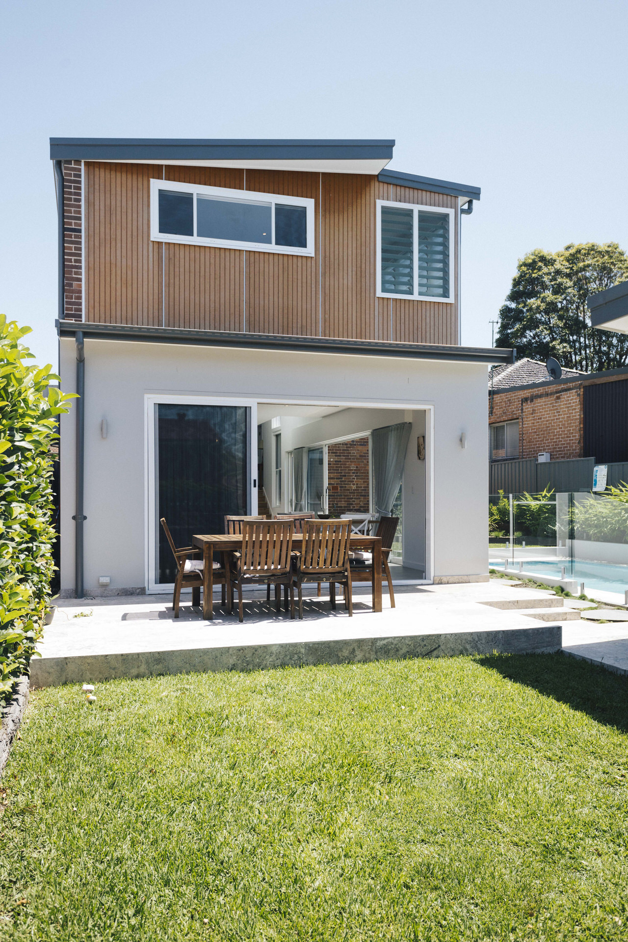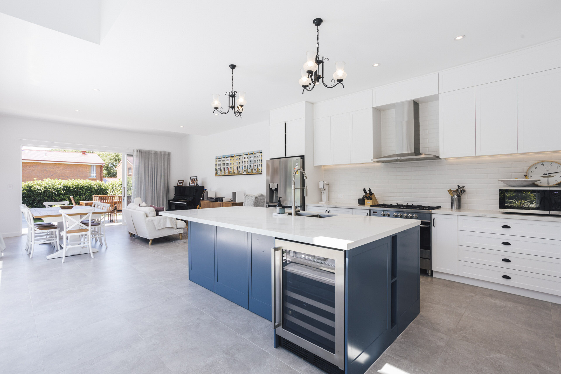 Inside, the design features an open-plan kitchen, living, and dining area, elevated by high-end joinery and sleek, modern finishes. Natural light floods these spaces through large windows and strategically placed skylights.