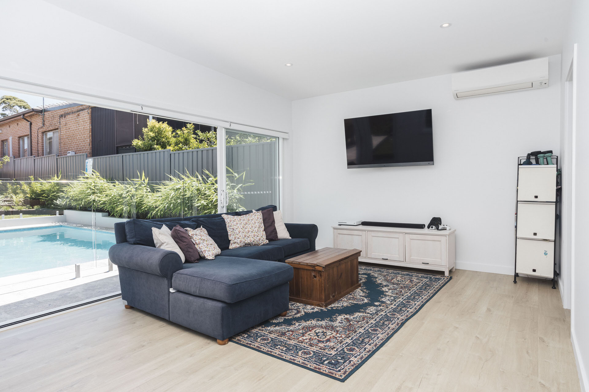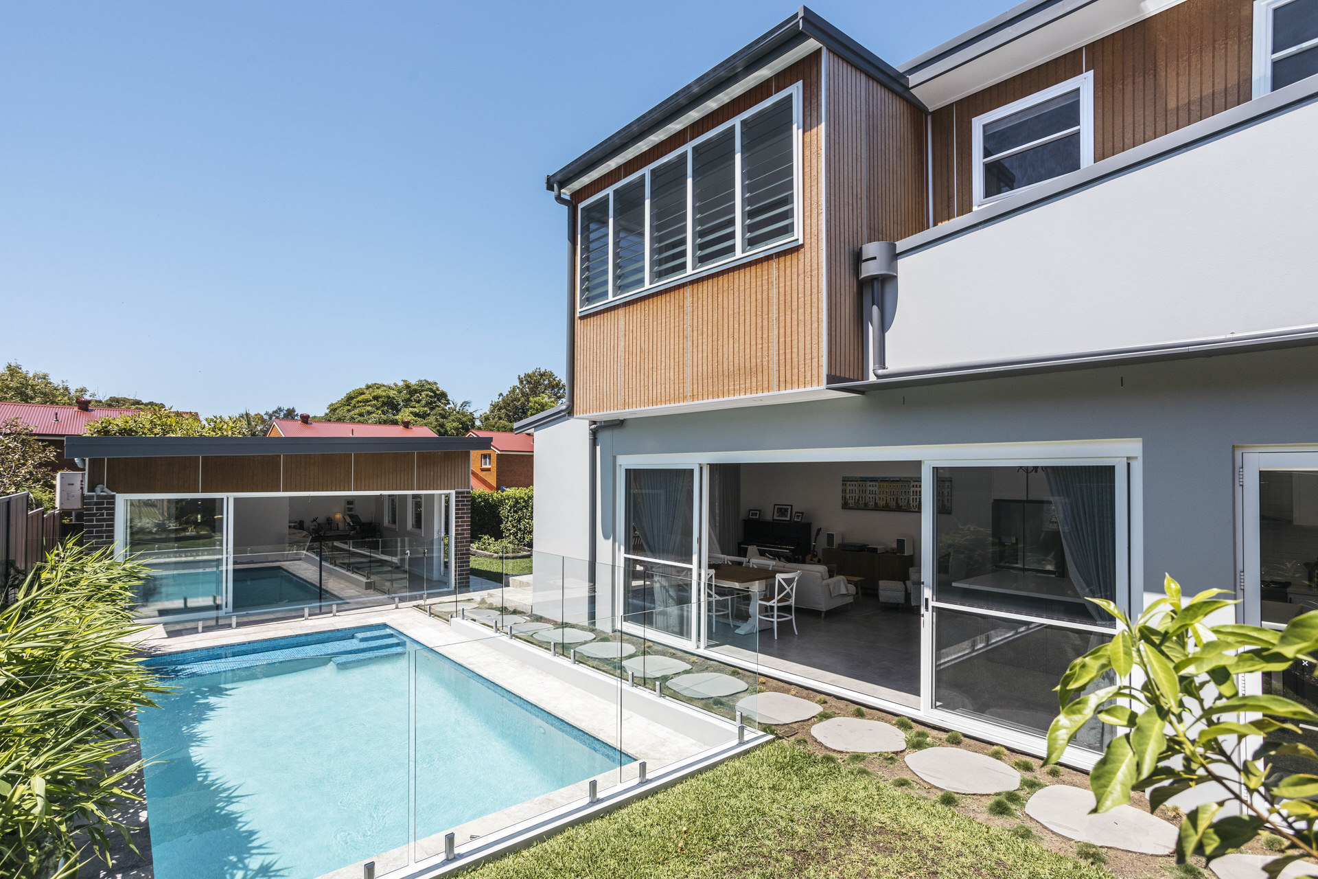 The outdoor space was reimagined with lush landscaping, a new pool, and an alfresco entertaining area. The result is a striking reinvention that balances flow and functionality with effortless indoor and outdoor living.