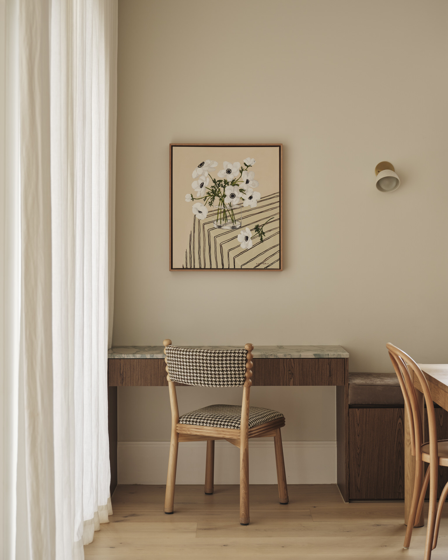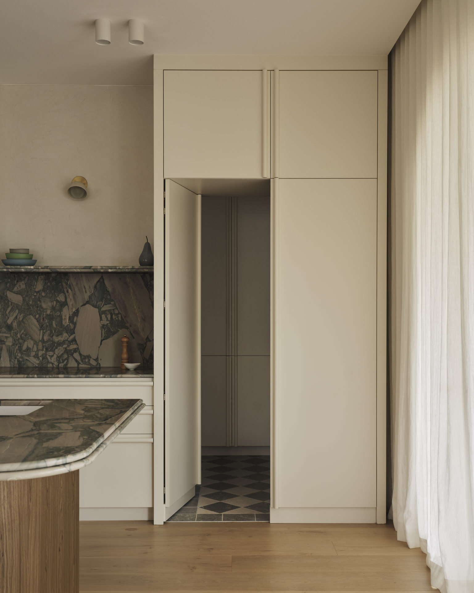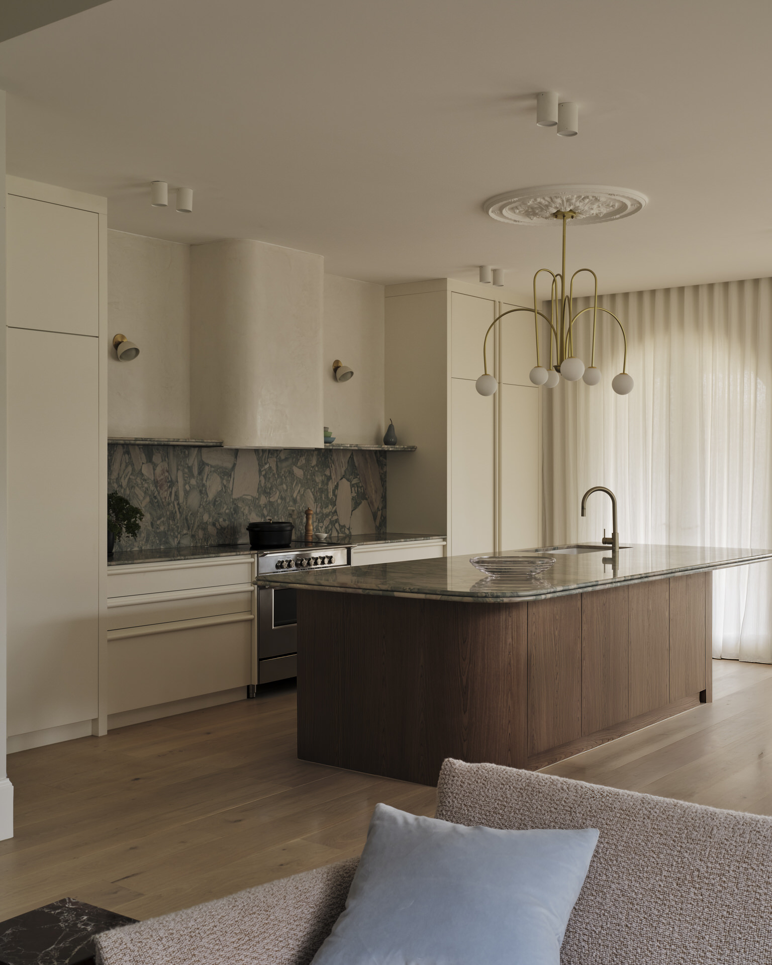 Rich textures, carefully curated finishes, and bespoke details define the home, with soft curves and stone accents introducing depth and quiet individuality. Every space was carefully considered to foster connection and comfort, guided by a refined material palette and crafted with precision.